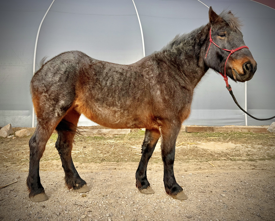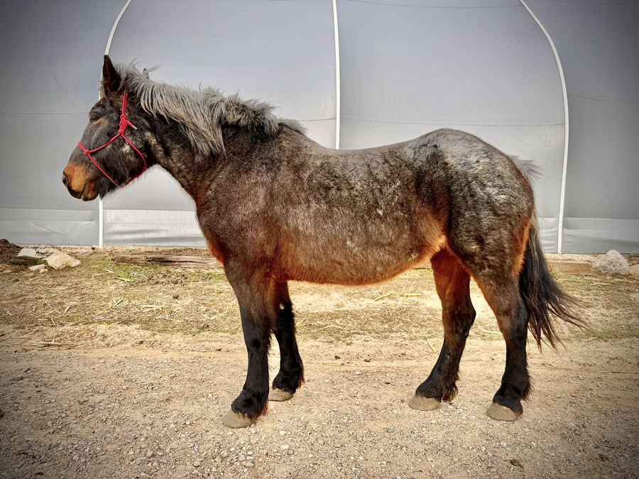 Flicka is a Bay roan draft cross mare, 16 hands high, approximately 17 years old.