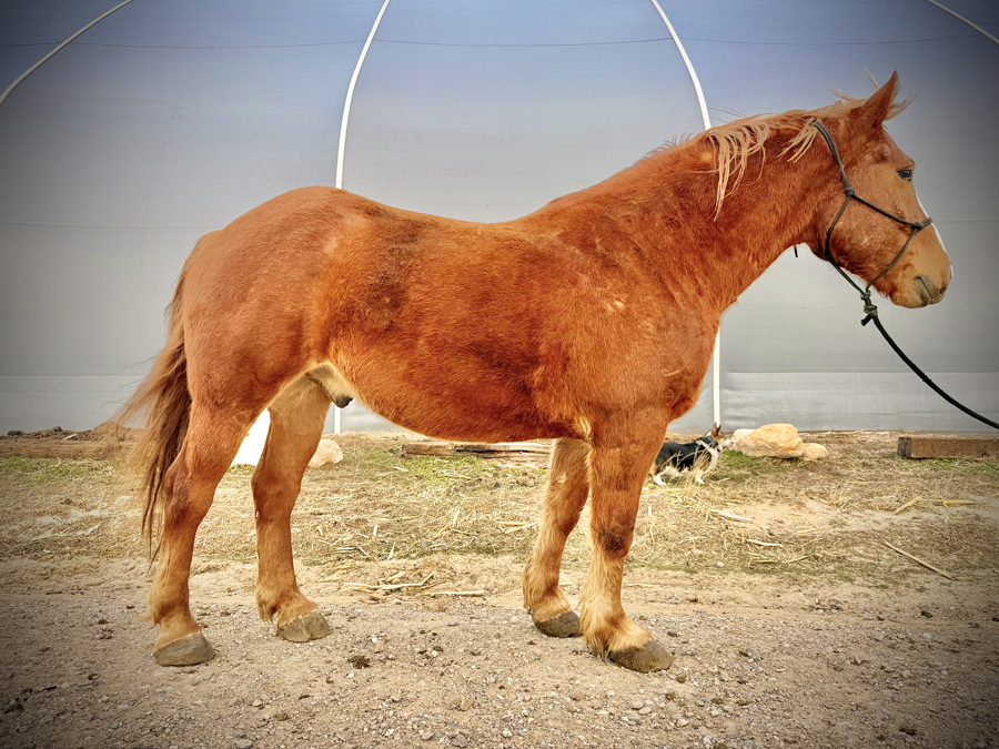 Ricka is a Sorrel Belgian draft cross mare, 16.2 hands high, approximately 19 years old.